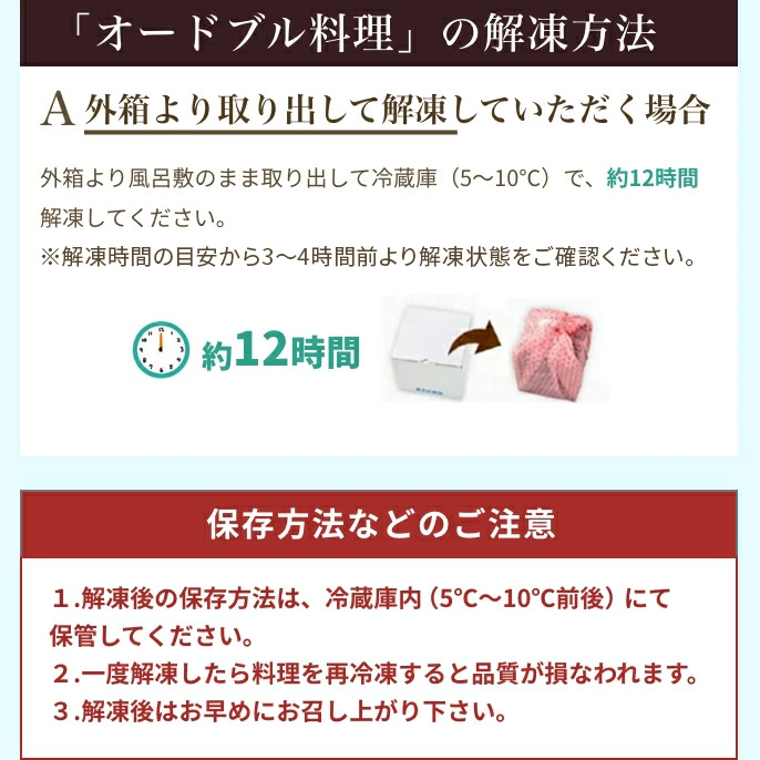 解凍時間は、外箱から風呂敷ごと商品を取り出し、15℃~20℃で約12時間程かかります。