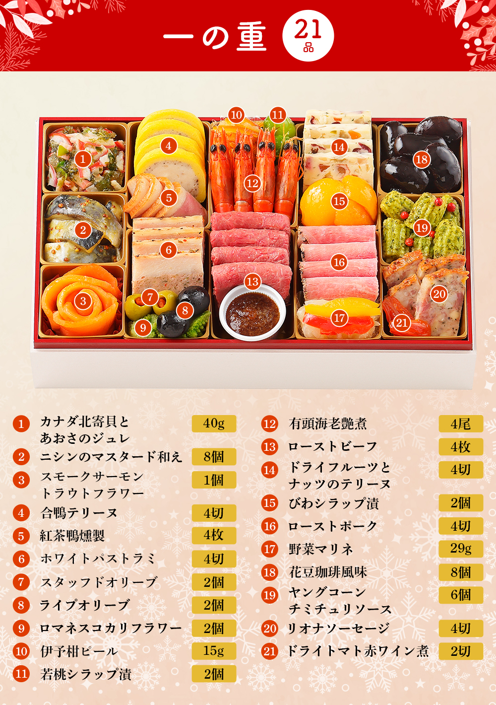 カナダ北寄貝とあおさのジュレ、ニシンのマスタード和え、スモークサーモントラウトフラワー、合鴨テリーヌ、紅茶鴨燻製、ホワイトパストラミ、スタッフドオリーブ、ライプオリーブ、ロマネスコカリフラワー、伊予柑ピール、若桃シラップ漬、有頭海老艶煮、ローストビーフ、ドライフルーツとナッツのテリーヌ、びわシラップ漬、ローストポーク、野菜マリネ、花豆珈琲風味、ヤングコーンチミチュリソース、リオナソーセージ、ドライトマト赤ワイン煮